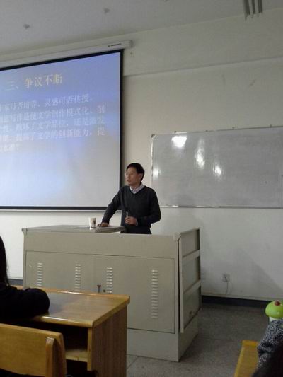 刁教授以“创意写作的历史与启示”为题,从自己访学经历中遇到的一系列创意写作问题讲起,带领同学们了解了创意写作的缘起、历史、争议及其启示,强调大学应该成为文学阅读、文学批评和文学创作的引领者,引导同学们关注创意写作的本土化。刁教授具有很强的亲和力,而且他将理论与现实相结合,激发了同学们的兴趣,整个讲座大家都积极活跃。