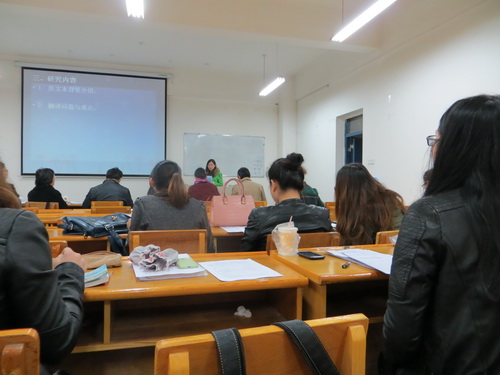 会上,2013级的翻译硕士研究生们向各位导师详细展示了他们毕业翻译实践报告的开题计划,各位导师根据每位同学的翻译文本和开题计划指出了问题,并提出了针对性的修改意见,同学们也都十分认真地听取着导师们的教导。