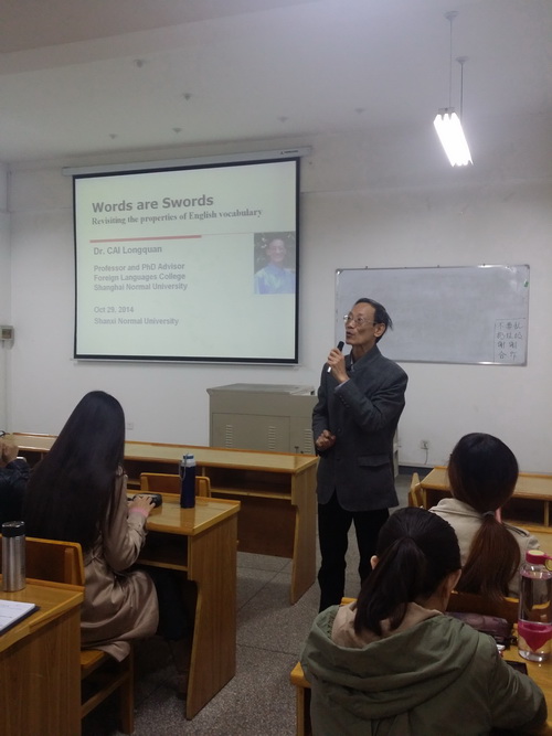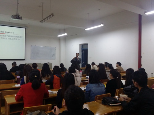 蔡教授以“词如刀枪”为题,带领同学们重温英语词汇的价值,给同学们讲解了“词汇—内容—信,语法—结构—达,语言—外表—雅”之间的关系以及从日常生活角度出发,引导同学们了解从词语背后所蕴含的深层含义,并注重在交流过程中词汇的选择与运用,激发了同学们的学习兴趣。蔡教授幽默,诙谐的语言风格让整堂讲座气氛活跃。