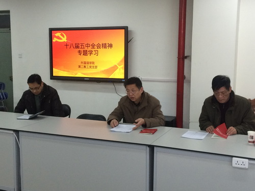 2015年12月15日下午,太阳官网教职工第二党支部全体党员在大外部会议室召开党的十八届五中全会精神专题学习会,参会的学院领导有学院党委书记申书琪、院长秦杰、大外部主任裴耀师,会议由大外部主任裴耀师。