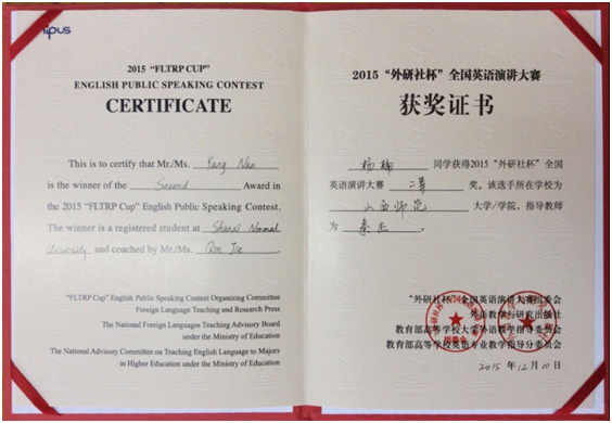 12月5日—12月11日,2015年“外研社杯”全国英语演讲大赛在北京举行。我院2013级学生杨楠从来自全国30个省市自治区和港澳台地区的124名选手中脱颖而出,荣获“外研社杯”全国英语演讲大赛全国总决赛二等奖。