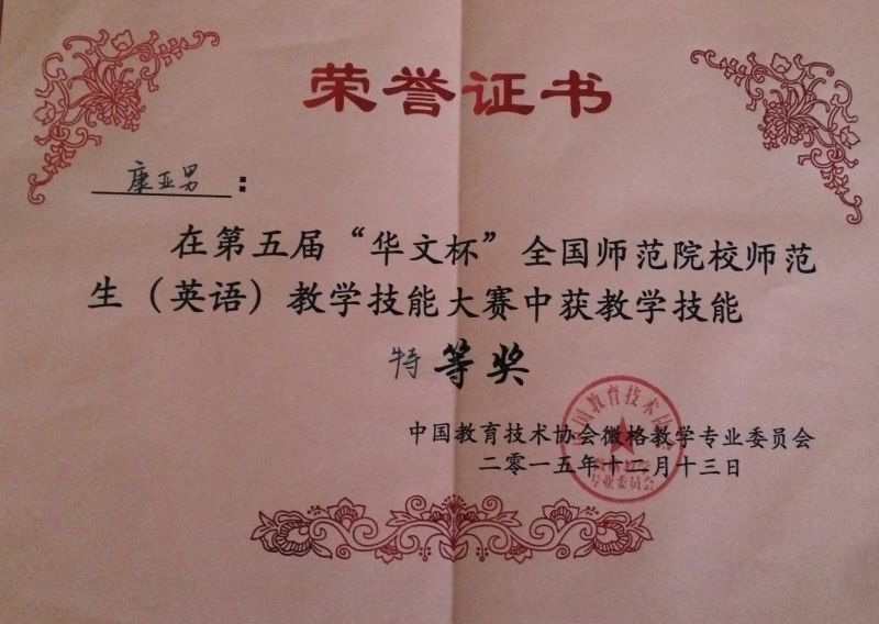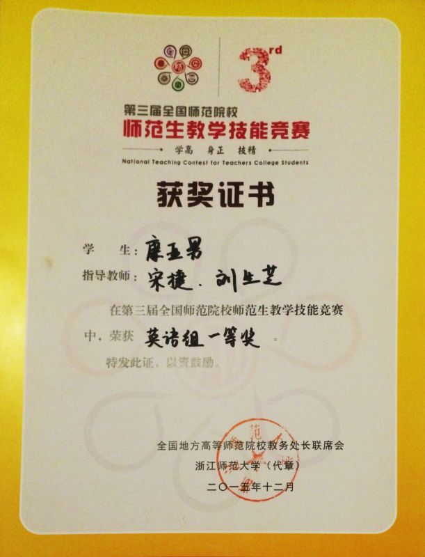至7日,由全国地方高等师范院校教务处长联席会议主办的第三届全国师范院校师范生教学技能竞赛在浙江师范大学举行。本次大赛共有华东师范大学、首都师范大学等全国92所师范类院校的341名选手参赛,康亚男同学继续发力,获得了英语组的最高奖项一等奖。