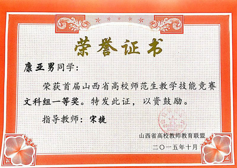 到25日,由山西省高校教师教育联盟举办、我校承办的首届山西省高校师范生教学技能竞赛在我校举行。15vip太阳集团官网严格按照教务处的要求,认真选拔人才、研读竞赛标准、开展封闭性训练。最终,宋捷老师指导的学生康亚男获得了文科组一等奖第一名的优异成绩。