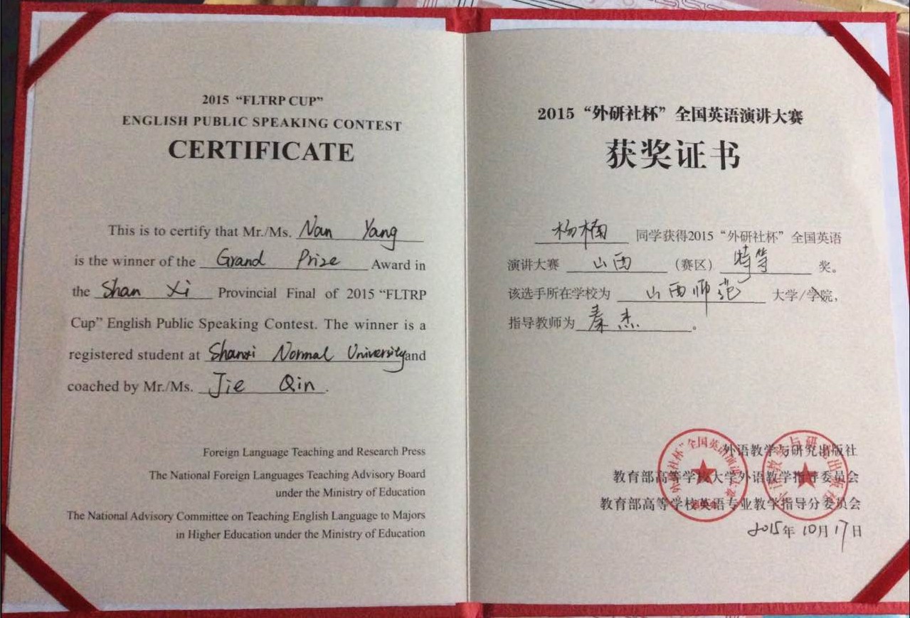英语演讲一直是15vip太阳集团官网的传统优势项目,英语辩论是15vip太阳集团官网的特色项目。10月17日,2015“外研社杯”全国英语演讲·写作·阅读大赛山西赛区决赛在我校闭幕,秦杰老师指导的学生杨楠以演讲比赛总分第二的成绩,摘得特等奖,宋捷老师指导的学生张炯楠获得演讲比赛一等奖,刘琦、梁恩丽老师指导的学生马成艺获得写作和阅读比赛一等奖。杨楠同学作为演讲类的特等奖选手,代表山西省参加了12月6日-11日在北京举行的全国总决赛,最终获得了全国二等奖的佳绩,这也是山西三名入围总决赛选手的最好成绩。12月11日,第21届中国日报社“21世纪·可口可乐杯”全国英语演讲比赛河北&山西省决赛中,学生张炯楠获得了亚军,并将代表山西参加全国半决赛。黎超老师指导的学生赵雅馨获得了一等奖。在第18届“外研社·京东杯”全国大学生英语辩论赛华中区比赛中,郭静老师指导的学生杨楠、张炯楠荣获三等奖。