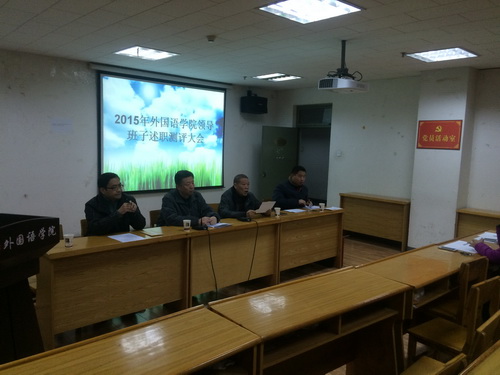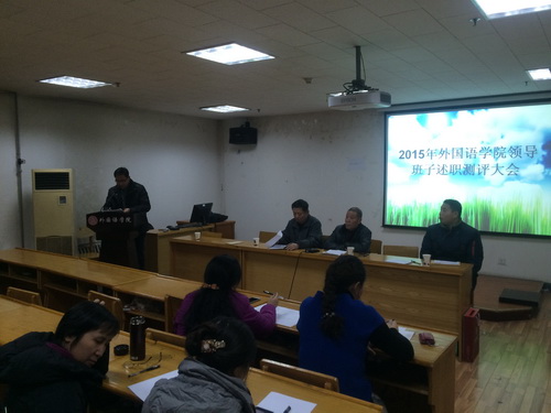 2015年12月17日晚7:00,太阳官网全体教师及学生代表于11722会议室召开2015年领导班子述职测评大会,参加会议的领导有学校纪委副书记杨建功、组织部代表郝炯炯、学院领导班子成员,会议由党委书记申书琪主持。