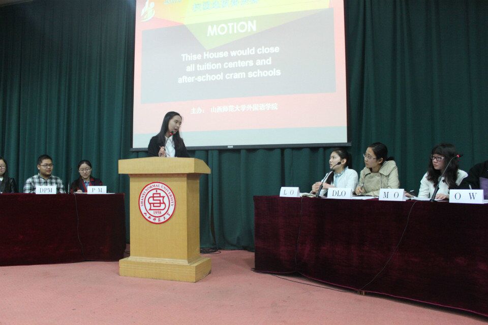 本次比赛严格遵循英国议会制辩论流程,全校各院经过初选共推选40多名选手进入复赛,层层比拼,最终8位选手跻身决赛,通过赛前20分钟抽取各自辩论角色及辩题:This House would close all tuition centers and after-school cram schools(是否应关闭所有的收费补习班和辅导中心),并且针对辩题冷静思考,认真准备。