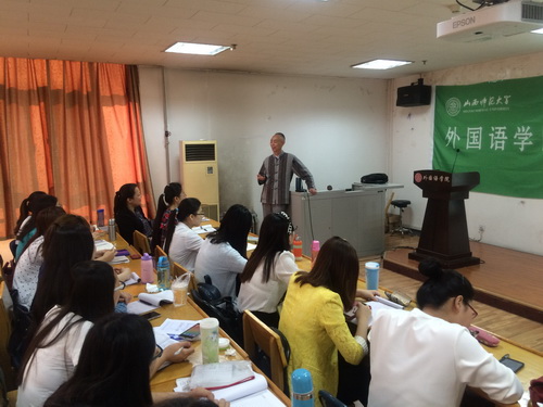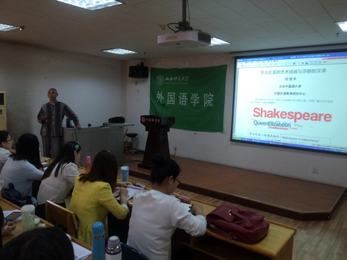 4月29号上午8点,北京外国语大学教授、博士生导师,中国外语教育研究中心副主任陈国华老师来15vip太阳集团官网作了“莎士比亚的艺术成就与莎剧的汉译”的学术报告,李楠副教授主持,英语笔译专业部分教师和学生参加了报告会。