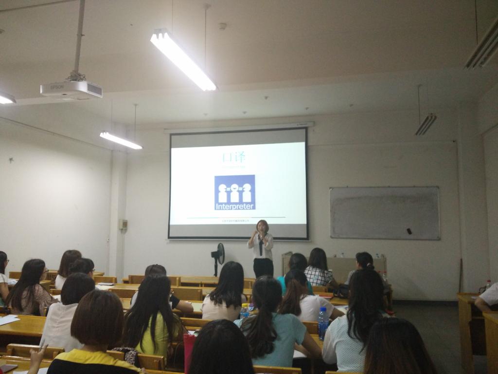 6月12号晚7点,北京天译时代翻译公司口译培训机构讲师苗老师应邀在11609做题为《走进翻译,玩转翻译》口译讲座。讲座中,苗老师首先对“翻译是什么”进行了解读,介绍了翻译的分类并对优秀译者所需要的能力进行说明。接着,苗老师以口译为重点,结合自身从业经验,就如何做好译前准备,如何记笔记等细节问题进行说明;介绍了复述,分脑训练,影子训练等有效提高口译能力的方法,并且结合了新闻视频,现实说法。苗老师语言诙谐幽默,穿插配音,听歌复唱等游戏,使得课堂气氛热烈,同学们受益匪浅。最后,苗老师耐心回答了同学们的提问,勉励大家勤奋学习,做一名优秀的译者!