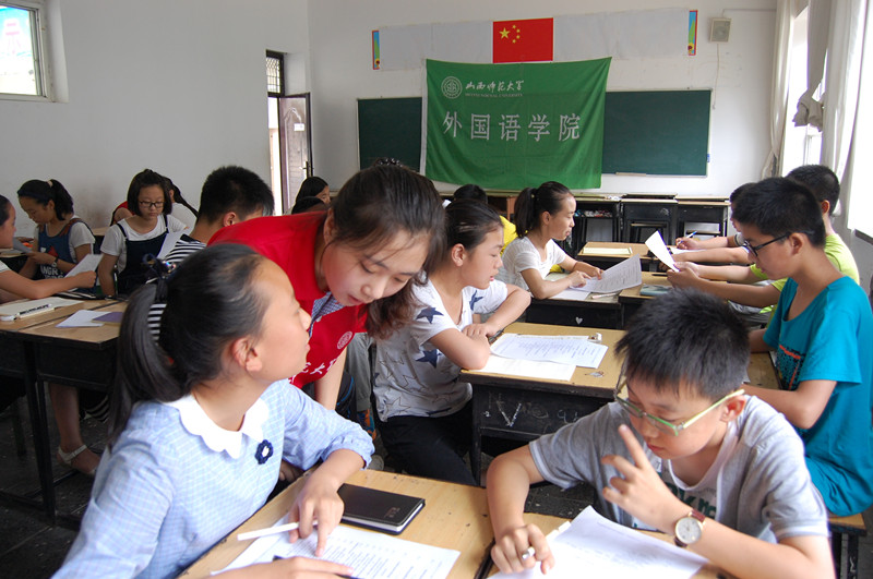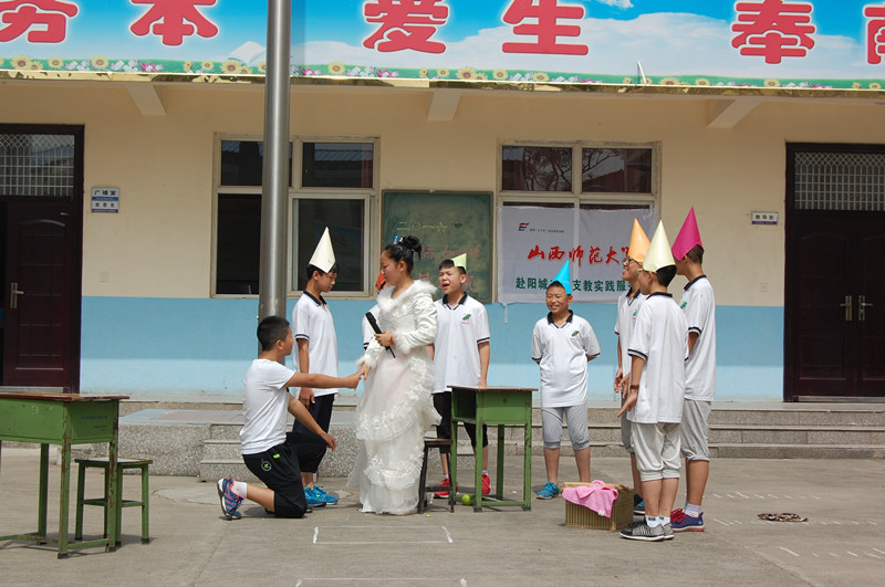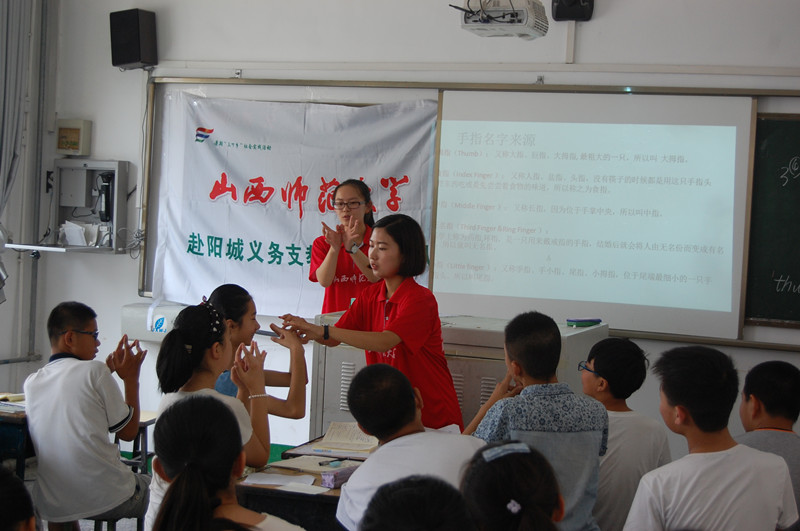 7月10日早上8点,在指导老师黎超的带领下,太阳官网义务支教实践服务队冒着小雨,踏上了志愿服务的征程。当天下午顺利抵达阳城,在与校方接洽、熟悉校园和教室教具使用情况后,支教活动于次日展开。支教过程中,队员们充分利用自己在校所学知识以及课堂经验,结合当地学生们的自身情况,针对性地进行创新式小班教学。志愿者们将每天上课内容分为音标教学和话题学习两大主题,通过英文歌曲、电影片段、奖惩游戏、绕口令、国际音标视频与角色扮演等多种形式调动学生们的积极性,引导学生们在欢乐轻松的氛围中学习西方文化知识,提升英语口语能力。
