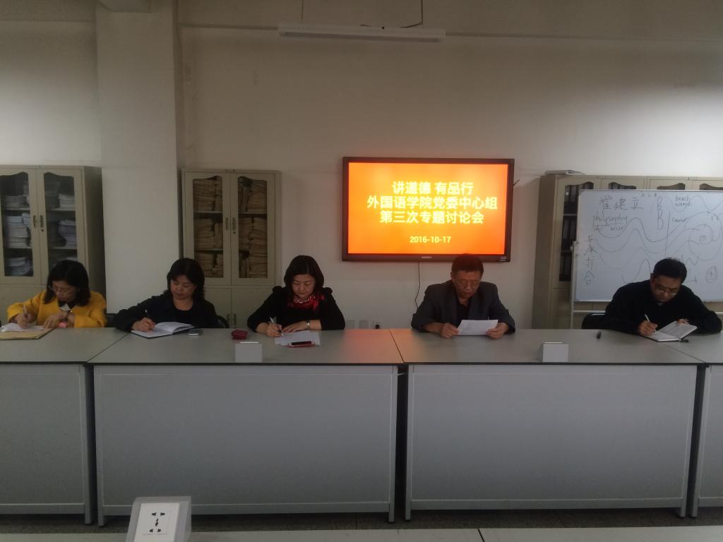 17日下午4:30,太阳官网党委中心组成员于英语系办公室11714召开第三次“讲道德 有品行”专题讨论会,会议由党委书记申书琪主持。