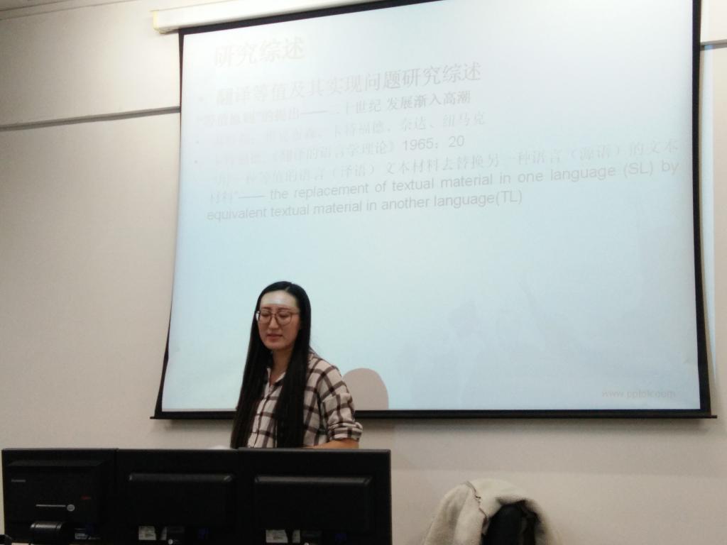 王老师主要从四部分着手,第一部分从中外传统译论入手对翻译的定义、翻译的目的及标准进行了探讨,引出等值概念;第二部分对等值及翻译转换及其实现方式相关方面的理论研究进行了综述,并得出对卡氏理论的辩证思考;第三部分主要是实例分析,结合翻译实践当中的译例对卡特福德所定义的两大类转换:层次转换和范畴转换进行了考证;最后一部分总结相关理论及实践案例得出相对等值实现的可能性以及翻译转换策略的可行性:“翻译求似不求等”。建议我们在具体翻译实践当中,应该综合考虑文本的特定性、译者的特定性以及读者的特定性,充分了解源语和目标语在语言形式和结构上的差异,以尽量减少“翻译腔”的现象,尽可能弥补对原文意义的缺失,实现最大限度的翻译等值。