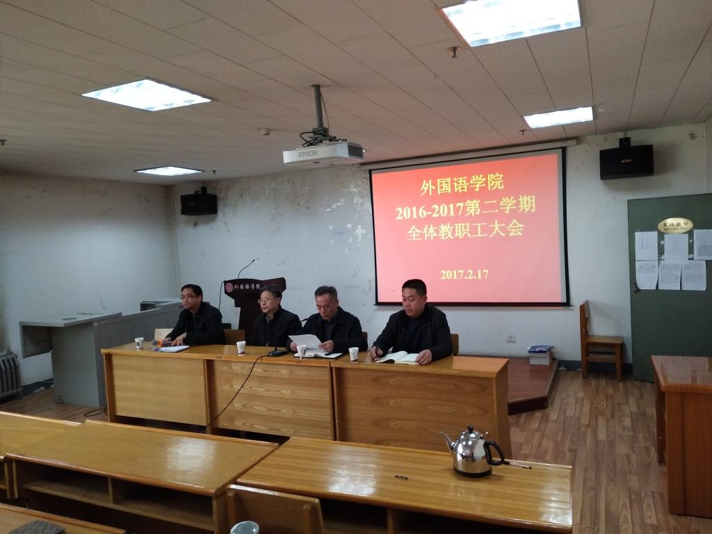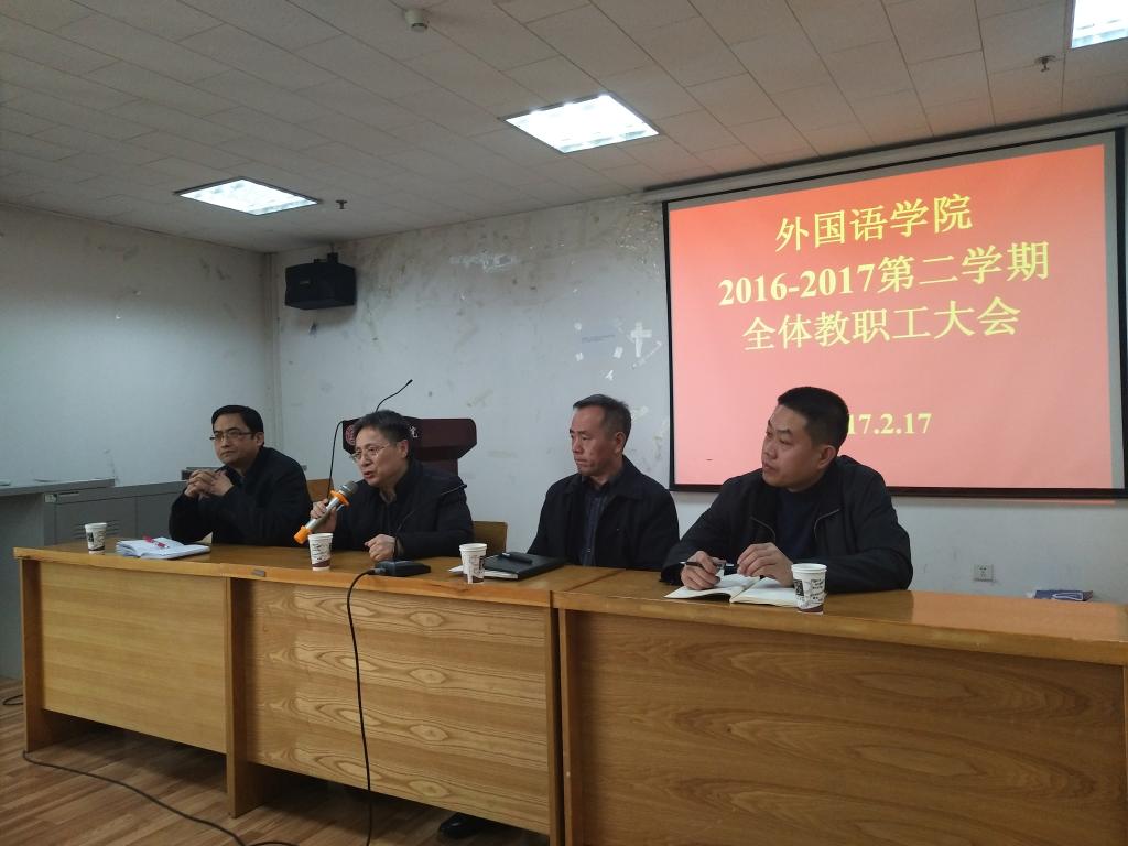 2月17日下午,15vip太阳集团官网在11722会议室召开了全体教职工大会,参加会议的还有校党委副书记薛耀文,校党委委员、组织部部长薛明耀,会议由15vip太阳集团官网院长秦杰主持。
