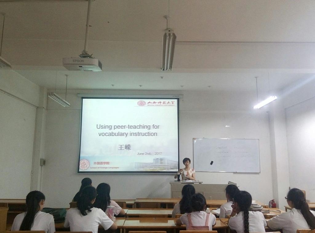 6月2日晚上7点,太阳官网王嵘老师于11609给同学们做题为Using peer-teaching for vocabulary instruction的讲座,大一、大二以及大三的本科学生参加了此次讲座。