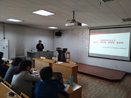 贾绘泽院长以《中国特色社会主义新时代、新矛盾、新思想、新征程》为题从中国共产党的初心和使命、中国特色社会主义进入了新时代、社会主义初级阶段主要矛盾已经转变、新时代中国特色社会主义思想、开启全面建设社会主义现代化国家新征程、坚定不移推进党的建设新的伟大工程六个方面为大家深度解读了党的十九大报告内容。整场报告既深入浅出又面面俱到,既发人深省又振奋人心。郭李鹏书记就本次主题学习会的目的与意义作了说明,要求大家通过贾院长的报告认真领会党的十九大精神,了解党和国家最新的政策及动向,提高自己的理论素养,并在实践中贯彻落实。秦杰院长围绕学习贯彻十九大精神对全员教职工的工作提出了几点具体要求,号召大家共同努力推动学院的快速发展。