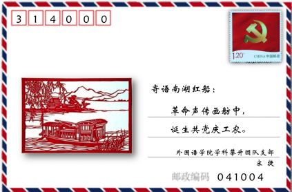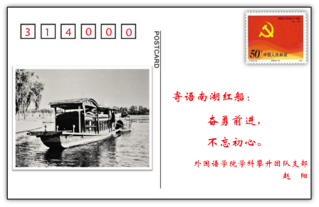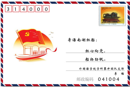 接下来,为了更好地体现主题党日的特色,支部开展了“寄语南湖红船”的明信片设计活动。大家在事先准备好的5个明信片模板、36张南湖红船图片、5种南湖红船相关的邮票图片中分别选取自己心仪的样式,合成了21张个性主题明信片,并在上面写下每个人对红船精神的寄语。这21张明信片,色彩鲜明、构思巧妙、语言诗意,承载着学科攀升团队支部每位成员对红船精神的理解、向往与承诺。