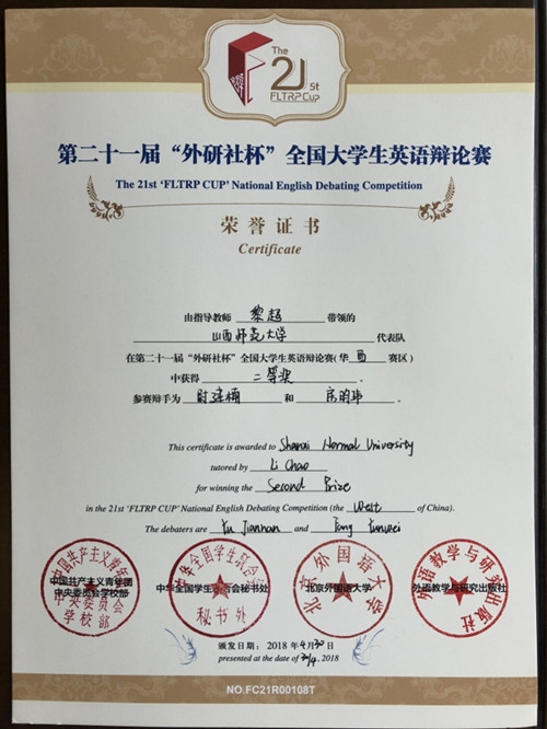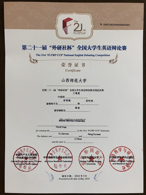 我院尉建楠和房昀玮两名辩手与指导教师黎超组成参赛队伍,通过参加四月底华西赛区入围全国总决赛。在六天的比赛时间里,两名辩手沉着冷静,积极应对,展现出扎实的英语功底和长期的知识积累,最终取得全国三等奖的优秀成绩,这是我校在英文辩论比赛中取得的最好成绩。在比赛中,太阳官网参赛队伍与来自其他高校的辩手和老师,交流沟通,学习成长,不断提升思辨能力。