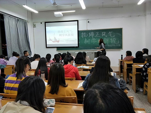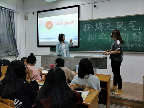 班会上,各班采用ppt演示与集体讨论发言的形式,就学风建设的含义、作用及要求等作具体说明与阐述,使同学们了解到学风建设是全校师生在治学精神、治学态度和治学方法等方面的体现,也是大家知、情、意、行在学习问题上的综合表现。同时,开展学风建设可以使同学们养成良好的学习行为与习惯,促进课堂教学活动的开展。各班也在主题班会上就课堂考勤制度、学习状况、作业完成情况等学风建设活动对同学们作了具体要求。