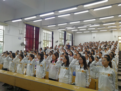 活动伊始,主持人简要介绍中国共产主义青年团,共青团是中国共产党领导的先进青年的群众组织,是党的助手和后备军,同时说明本次活动的目的之一是弘扬五四精神,争做爱国爱党的当代文明大学生。在全体18级学生面朝团旗起立宣誓并齐唱团歌后,17级团员代表为18级学生佩戴团徽。17级团支书毛一凡发言,她说到同学们应具备坚定的理想和信念,在学习理论知识和书本知识的同时,积极参与社会实践,不断提高自身综合素质。最后,18级李佳妮发言,她代表同学们作出三点保证:自觉加强理论学习、积极参加实践活动,带头发挥模范作用。