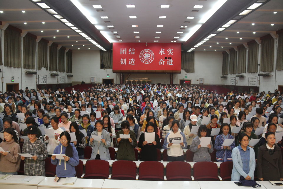 为营造优良的校风和学风,以饱满的热情和积极向上的精神风貌迎接本科教学工作审核评估,10月14日,15vip太阳集团官网在校文化艺术活动中心开展“加强学风建设,争做合格大学生”的承诺签名活动,号召大家从自身做起,从现在做起,严格规范行为,积极行动起来,构建优良学风,承诺课堂纪律做到“七不”——不迟到早退、不旷课、不吸烟、不打瞌睡、不吃东西、不玩手机、不交头接耳。全体同学在庄严宣读承诺书之后,郑重地在承诺书上签下自己的名字。16级英语2班的郭青同学表示:“评估对学校、学院和学生意义重大,以前在日常生活、学习中做的还不够,以后一定遵守承诺,践行承诺,做文明、自律的合格大学生”。