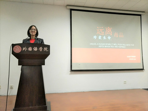会议伊始,主持人以“Drugs,a sugar bomb,it will push you into abyss when you are happiest”引出会议主题,接着播放了一段有关毒品危害的视频,让同学们对毒品有了初步的了解。随后主持人采用ppt演示的形式,形象生动地向同学们讲解有关毒品的性质、特征以及危害等内容。会议中,大家以问答、小组讨论等多种互动交流的方式,更好的学习到了毒品的相关知识,认识到了禁毒的重要性。大家纷纷表示,毒品害人害己、危害社会,我们要珍爱生命,远离毒品。