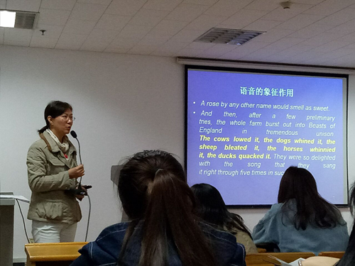 讲座中,张君从音段与超音段两个层面,对英语和汉语的语音进行对比分析:音段层面,主要涉及英汉两种语言的语音体系、音位、音节等;超音段层面,主要涉及英汉两种语言的重音、节奏、语调/声调等方面。结合现阶段学生的语音学习情况,佐以大量生动的例子和有效的技巧,分享了如何通过理论联系实际的方法,运用英汉对比分析,克服客观条件带来的不利因素,力争在较短的时间内学习英语发音、听音的技巧。此外,讲座中还穿插谈到了国内外知名的语音学家、语音学趣事,进一步激发了同学们对英语语音学习的兴趣和动机。