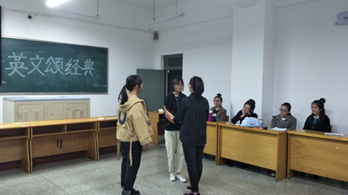 本次活动由康文平、刘馨怡、赵瑞芸、吕雅茹、张耀敏五位同学担任评委,参赛小组以宿舍为单位,自导自演,评委们根据服装、语音、内容、情感、创新五个方面进行评分。表演在田晋艳同学的主持下正式开始,同学们用自己的真情实感将《白雪公主》、《美女与野兽》等经典名著演绎的栩栩如生,翻拍历史剧《荆轲刺秦王》以幽默的表达、形象的表演,引得大家笑语不断。英文歌曲演唱《Love is an open door》和《Five hundred miles》,赢得大家一片掌声。