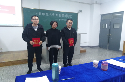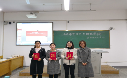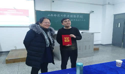 王明珠等7位入围选手依次上台展示自己的翻译作品,在展示中选手们结合自己的翻译作品和PPT,畅谈翻译中的疑惑和感受,对翻译中遇到的重点难点做了深入分析,分享了许多搜集文本信息的技巧以及文学文本的翻译技巧,经过三个多小时的角逐,评委们对每位选手的展示都做出了综合而深入的分析,并给选手打分,决出名次。三位老师随后为获奖选手颁奖。