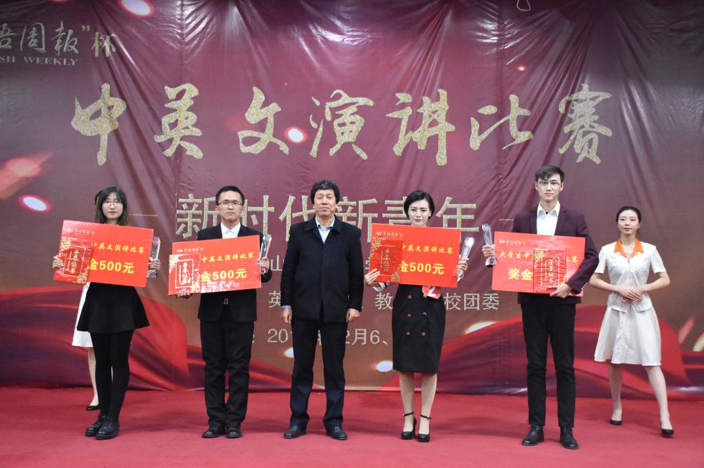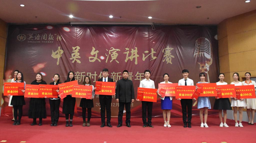 12月7日晚,在第二届“英语周报杯”大学生中英文演讲比赛结束后,校党委副书记高峰,校党委常委、副校长车文明为获奖选手颁发荣誉证书和奖品。