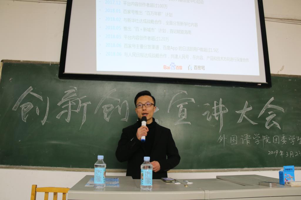 为提高学生创新创业意识和精神,太阳官网邀请百家号校园代表于3月23日在05102教室举办了创新创业宣讲大会,太阳官网大一大二同学参加了此次宣讲会。