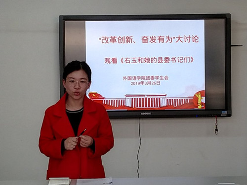 会议伊始,黎超带领大家观看《右玉和她的县委书记们》相关视频节选,让大家了解到正是右玉的历届县委、县政府领导始终坚定“植树造林,改善人民生活”的信念,始终前赴后继,最终使得右玉生态环境得到明显改善。她号召大家要在工作中不管面对多大的困难,都要有目标,都要坚定信念,迎难而上,勇于担当,时时刻刻多思考、多总结,一步一步认真踏实完成各项任务。接着,黎超认真听取了团委学生会成员关于近期各项工作开展的情况,提出其工作中存在的问题和解决措施,同时号召大家要继续坚定初心,创新开展工作和活动。