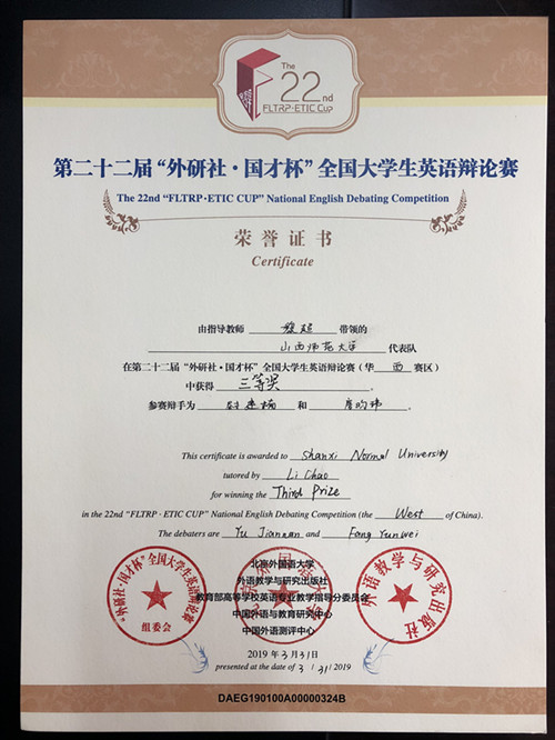 2019年3月29日至31日,第二十二届“外研社·国才杯”全国大学生英语辩论赛华西赛区决赛在四川师范大学成龙校区落下帷幕。来自山西、陕西、河南、甘肃、宁夏、四川、新疆、西藏等11省市自治区的86所院校参加本次比赛。太阳官网学生尉建楠、房昀玮在教师黎超的带队指导下,认真准备,积极应赛,在经过六轮循环赛的激烈角逐后,荣获华西赛区总决赛三等奖。
