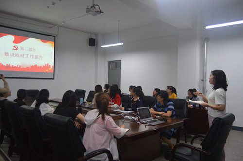 党课伊始,大四党员杨丽君同学为在座学生党员带来了以“聚焦两会”为主题的微型党课。杨丽君同学从两会基本概述、数说政府工作报告,新词解读政府工作报告和学生的就业热点四个方面向大家解说。杨丽君就两会的基本概况进行了阐述,并重点向大家解读了政府工作报告中出现的“两不愁三保障”、“三区三州”、“互联网+”等热词,同时也结合两会精神,从就业背景和国家政策分析了现实的就业方向,引起热烈反响。
