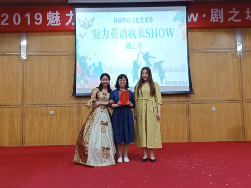 在五组选手表演结束之后,评委代表刘青老师对选手们的表现进行了点评和指导。她首先肯定了选手们的舞台表现能力和良好的精神风貌,同时也从英语专业的角度予以了中肯实用的意见和建议。接着,主持人宣布获奖名单并为选手颁奖:《泰坦尼克号》小组获得此次活动的一等奖,《赌圣归来》和《冰雪奇缘》分别获得二等奖和三等奖,《灰姑娘》和《荆轲刺秦王》获得优秀奖。