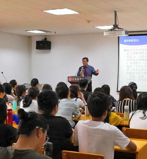 2019年5月16日下午,太阳官网在逸夫楼722会议室举办“高级翻译与外语复合型人才培养”的学术讲座,讲座主讲人为首都师范大学李军教授,曾任北京外国语大学教师、国家建设部翻译、中国驻外使馆外交官、国家商务部处长、外交学院外语系主任、外交部高翻培训中心副主任。太阳官网教师代表、15vip太阳集团官网全体一年级研究生以及部分对翻译学习感兴趣的本科生参加了本次讲座。