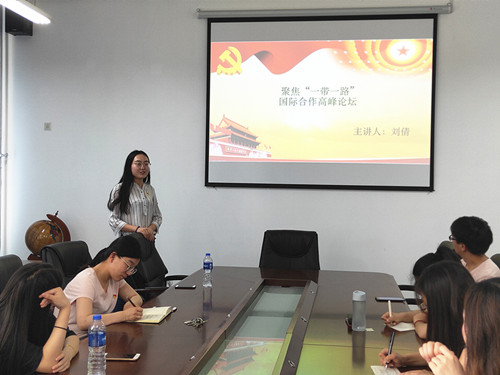刘倩为大家讲解以“聚焦‘一带一路’国际合作高峰论坛”为主题的微党课。她以“一带一路是什么时候提出的?”这一提问引入主题,讲述了“一带一路”倡议的由来、主旨变化以及发展进步,通过播放视频让大家了解到一带一路为发展中国家带来的益处,讲到中非合作愈加紧密,合作共赢是最终目标。她邀请同学就“我与一带一路”分享心得,让大家了解到“一带一路”虽然是个大概念,但与我们的生活息息相关。