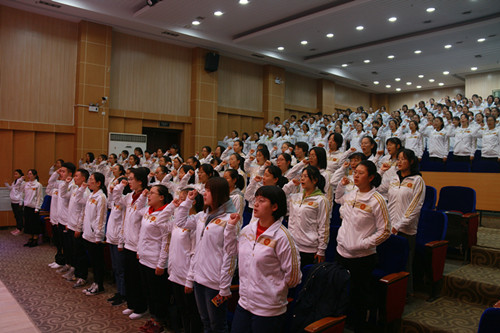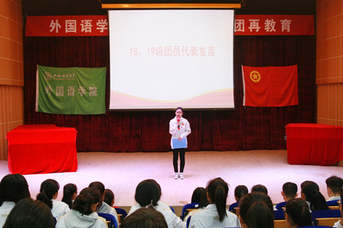 活动开始,同学们全体起立合唱共青团团歌。紧接着,由戎亚卿带领同学们了解共青团的基本知识。接下来,18级团员代表王洋发言,号召新生团员将团员义务与责任落实的实践中。接着,19级新生团员代表崔晓雅发言,表达了成为一名优秀团员的信心和决心,力求在实践中有所历练、有所成长。随后,领誓人戎亚卿带领新老团员一起重温入团誓词,再次明确团员身份;之后由18级入党积极分子为新团员及大一新生佩戴团徽。