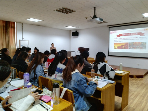 马克思主义学院老师苏继文用生动的语言讲授了“牢记初心使命 奋发担当有为”,他主要讲述了我党团结带领全国各族人民坚守初心使命,不断开拓前行的光辉历程。一张张照片记录了老一辈革命家的丰功伟绩和崇高的革命精神,培养了同学们刻苦学习、英勇奋斗、敢于探索的精神。院研究生党支部书记韩慧敏为同学们讲授了“中国共产党指导思想”,阐明我国不同时期的指导思想是一脉相承、与时俱进的,是指引党和国家事业不断走向胜利的行动指南。院本科生第 二党支部书记黎超讲授了“社会主义核心价值观”,通过真实的案例学习,使同学们更深刻地认识到了社会主义核心价值观的基本内容。之后,她讲解了习近平总书记对青年学生的嘱托,引导同学们争做新时代新青年。随后播放的《榜样4》和歌曲《国际歌》激发了同学们爱党爱国的热情,进一步提升了他们的思想认识。院本科生第一党支部书记刘丽从中国共产党第十九次全国代表大会简介及意义、新时代中国共产党新使命、争做合格党员三个方面讲授了“新时代中国共产党历史使命”,使同学们深刻认识到中国共产党的历史使命,激发了他们对党的崇拜之情。