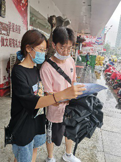 万柏林区分队的另一支队伍将宣讲地点选在柳巷一家补课机构附近。在与高中年级的学生及学生家长交谈的过程中,团队成员发现他们对公费师范生政策不够了解,于是成员们向他们详细介绍了我校公费师范生政策及国家助学贷款等相关事宜,热情细心地为他们讲解学校每年的招生情况、课程设置、师资力量及校园环境等。