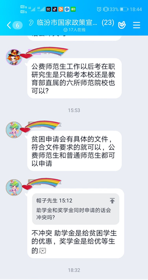 线上宣讲是临汾市宣讲队伍根据当前疫情形势所调整的宣讲模式。在顾及到线下宣讲地域限制的局限性后,又能避免线下聚集,临汾市宣讲分队通过创建QQ群聊,实时对入群的家长及学生提出的问题进行答疑,让本次宣讲做到最大程度的深入人心。