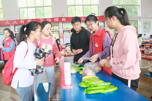 工作人员为践行光盘行动的同学发放奖品