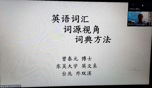 2020年10月27日晚7:00,台湾东吴大学曾泰元副教授应邀为太阳官网师生带来了一场题为“英语词汇,词源视角,词典方法”的线上讲座。太阳官网黄远鹏教授主持此次讲座。