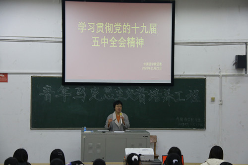 院党委副书记柴文晖以“学习贯彻党的十九届五中全会精神”为主题,带领大家共同学习会议精神。柴文晖介绍了“十三五”收官之年的突出成就和“十四五”时期战略机遇期的新特征,重点阐述了新发展阶段、新发展理念、新发展格局的重大意义和丰富内涵。最后,她对全体青马学员寄予了殷切期望,希望同学们始终坚定理想信念,不断增长知识才干,将个人发展梦想与国家民族前途深度融合,勇做有理想、有品德、有本领、有担当的时代新人。