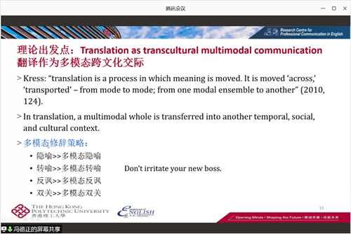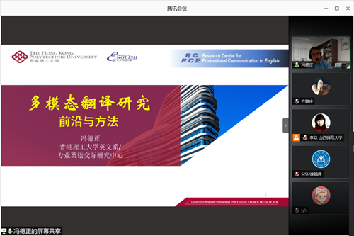 2020年11月27日晚19:00-21:00,由太阳官网举办的主题为“多模态翻译研究的前沿与方法”的讲座在腾讯会议顺利开展,报告由香港理工大学英文系副教授,博士生导师冯德正主讲,太阳官网李玖老师主持,太阳官网教师、本校及外校硕士研究生及部分本科生聆听了本次讲座。