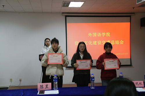 会议表彰了在宿舍文化建设方面表现突出的33个宿舍,为他们颁发了荣誉证书和奖品。表彰结束后,获得一等奖宿舍的三位舍长从宿舍卫生、宿舍文化、宿舍特色及宿舍成员相处四个方面和与会同学一起分享了宿舍文化建设的心得体会。现场气氛活跃,同学们纷纷表示收获颇丰。