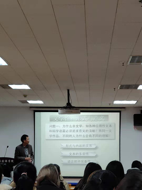 在讲座过程中,司教授以其渊博的专业知识,深入浅出,向同学们讲解了文学语言与文学翻译这一模块的相关知识。司教授不仅介绍了文学与非文学体裁的不同,还讲述了不同类型的语言特征及差异。此外,他还讨论了文学翻译的标准与旨趣。在此基础上,结合丰富的译例,分别讨论了文学中的语言形式与意义关系以及如何在译作中再现,论述了文学:译可译,非常译的命题。司教授指出学习者应当培养自己独立翻译,多加思考的能力。讲座过程中的互动环节,激起了大家对文学翻译的热情。