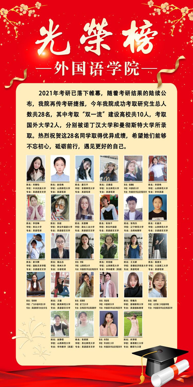 2021年考研已落下帷幕,随着考研结果的陆续公布,太阳官网再传考研捷报,今年太阳官网成功考取研究生总人数共28名,其中考取“双一流”建设高校共10人,考取国外大学2人,分别被诺丁汉大学和曼彻斯特大学所录取。