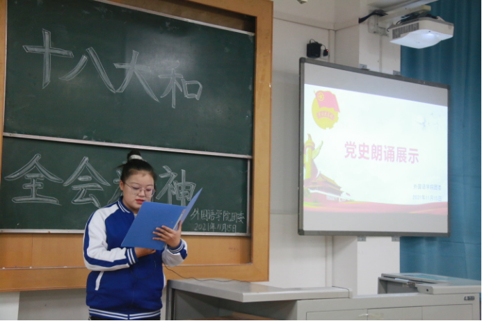 会议伊始,主持人刘诗琪为大家介绍本次会议的主要内容。接着,20级贺锦钰为大家介绍中国共产主义青年团第十八次全国代表大会的相关内容,带领大家学习中国共产主义青年团十八届五中全会精神,并提出倡议:当代青年团员要肩负起时代重任、敢于打破常规、勇于走出舒适区,为社会主义现代化建设贡献自己的一份力量。最后,21级各班代表进行党史朗诵展示,大家以饱满的情绪讴歌党的百年历程,会议在同学们的朗诵声中落下帷幕。