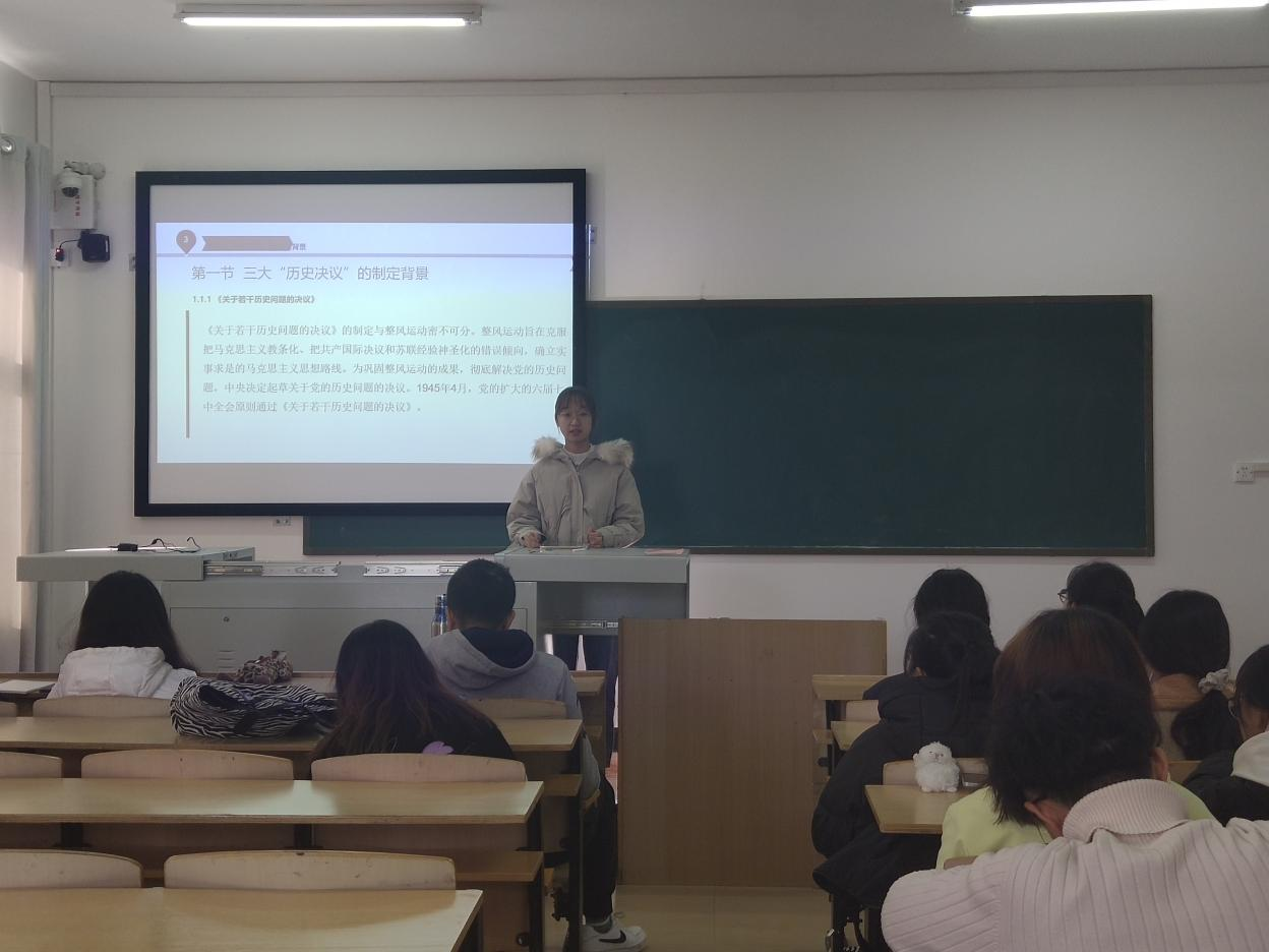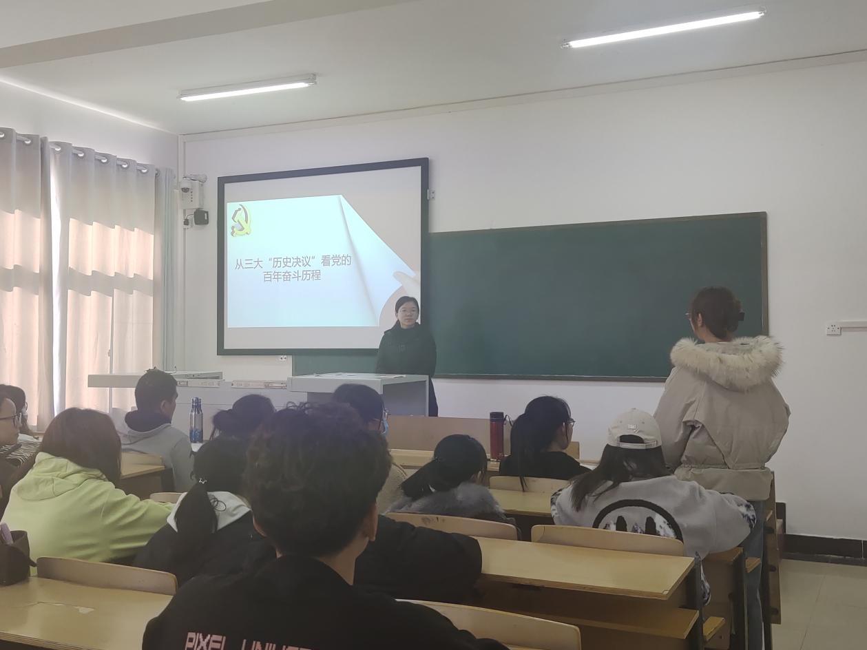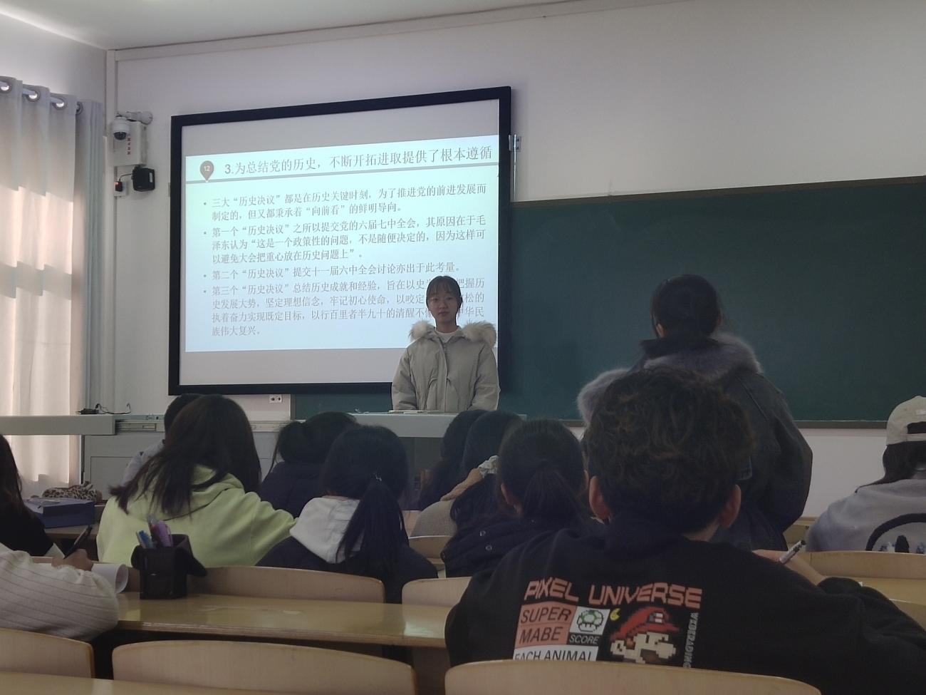 张丹丹给大家带来主题为“从三大历史决议看党的百年奋斗历程”的微党课。她介绍了《关于若干历史问题的决议》《关于建国以来党的若干历史问题的决议》以及《中共中央关于党的百年奋斗重大成就和历史经验的决议》的制定背景、主要内容以及它们的历史价值。1945年4月,党的扩大的六届七中全会原则通过第一大“历史决议”;第二大“历史决议”形成于改革开放新时期解放思想、拨乱反正的历史转折之中;第三大“历史决议”在中国共产党成立一百周年之际进行系统总结,与前两个不同之处在于它主要是总结成就经验,历史视野更加宽广。通过对“三大历史决议”的学习,同学们进一步了解了党的百年奋斗历程,懂得要不断审视走过的路,从中汲取经验教训。