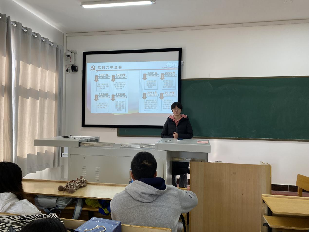 张向新以“以史为鉴、开创未来——学习贯彻党的十九届六中全会精神”为主题,带领大家回顾党的历届六中全会、深刻领会党的百年奋斗历史经验以及如何做到以史为鉴、开创未来。通过学习十条历史经验及其所深刻揭示的意义,大家进一步认识党的经验是我们党在历经艰辛、饱经风雨的长期摸索中积累下来的,包含着成败和得失,凝结着献血和汗水,充满着智慧和勇毅。她倡导大家作为青年一代要一方面继续深入学习党的发展历史,将理论与实际相结合;另一方面认真地对待每一件事情,成为有理想有信念有担当的新时代青年。