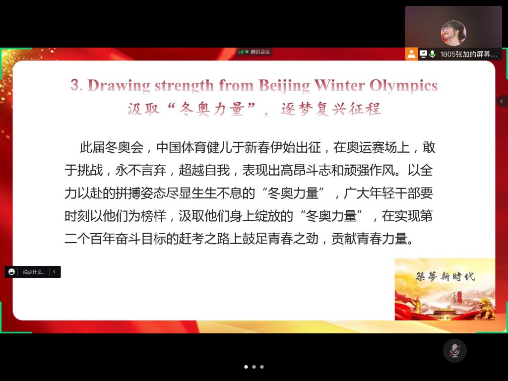 张加以“弘扬冬奥精神,做新时代拼搏奋斗者”为主题,讲述了北京冬奥会的特色亮点、冬奥健儿的精彩表现和冬奥精神。冬奥精神,即胸怀大局、自信开放、迎难而上、追求卓越、共创未来。张加鼓励大家作为青年大学生要从奥运健儿身上汲取成长的力量,在自己的思想、学习、生活和工作的“赛场”上不断砥砺初心、耐心、匠心,绘出最美青春画卷。